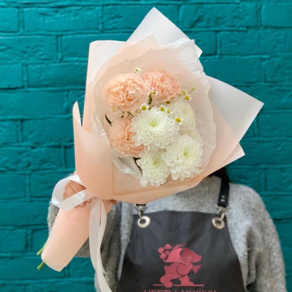 Нежный букет из хризантемы и гвоздики, в составе хризантема,3 стебля гвоздики и танацету