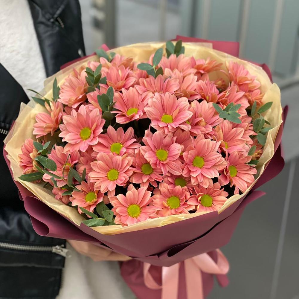 Букет из ромашковой персиковой хризантемы и эвкалипта в оформлении!
