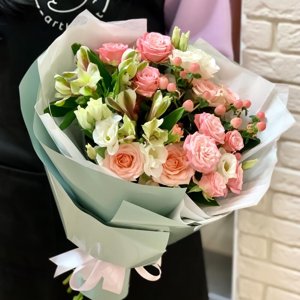 Альстромерия - 2 шт. Гиперикум - 2 шт. Лента - 1 шт. Кустовая роза - 4 шт. Зелень - 1 шт. Эустома - 2 шт. Матовая пленка - 2 шт.